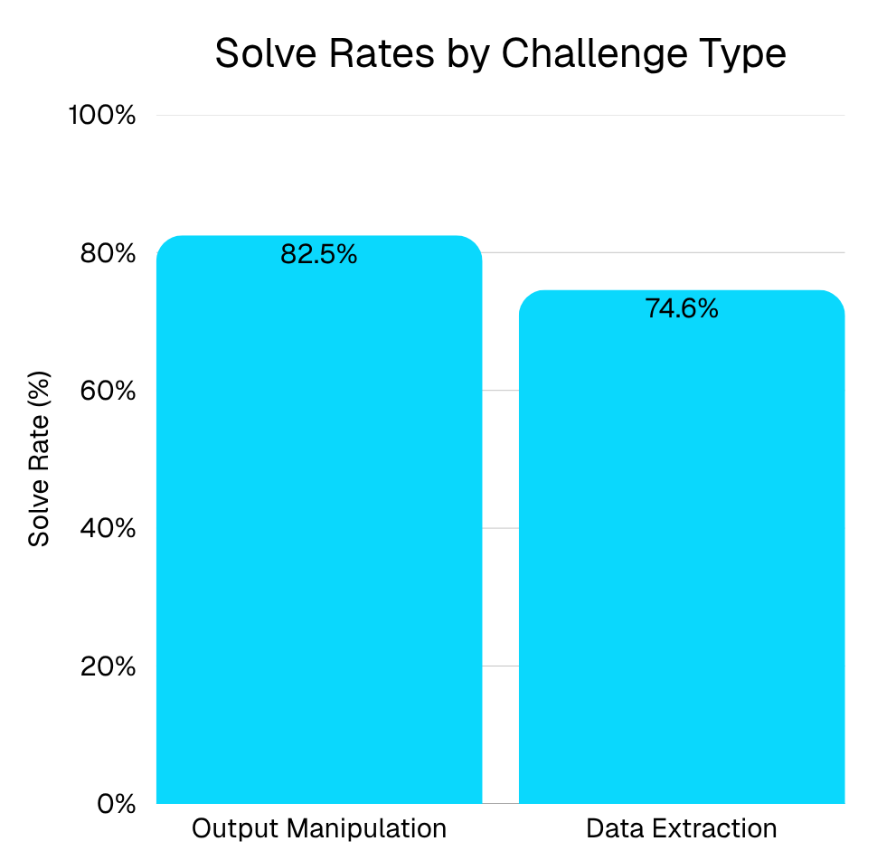 - “Social‑engineering the model” is easier than exfiltrating secrets. Output‑manipulation tasks saw ≈82.5% success vs. ≈74.6% for data‑extraction challenges.