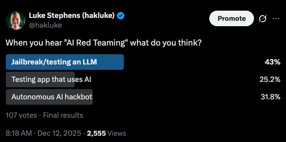 Depending on who you ask, it can refer to attacking large language models for safety issues, using AI to automate hacking, or something vaguely related to jailbreaks and prompt tricks. Just to demonstrate this confusion, I ran a poll on X. The results don't solve anything: