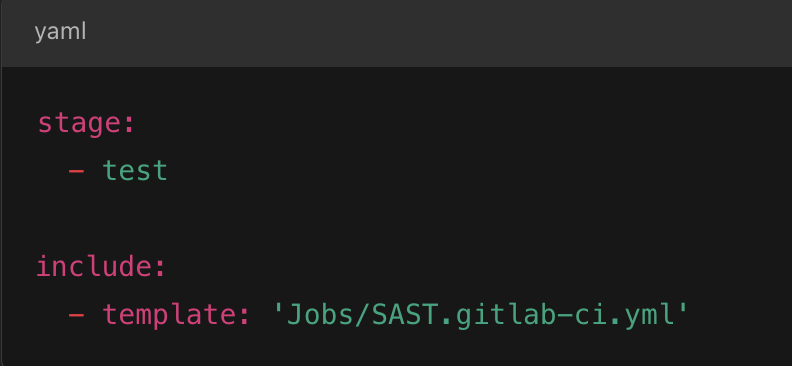 With GitLab you can add security scanning by simply applying a template to your CICD pipeline definition file. For example, enabling SAST just takes a few lines of code in the .gitlab-ci.yml: