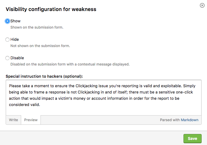 Hackers: Familiarize yourself with the new CWE types here. Weakness selector for hackers on report submission page Programs: Head to your program settings to hide and/or disable unwanted weaknesses and add special instructions to hackers when needed. Weakness configuration for programs on program settings page