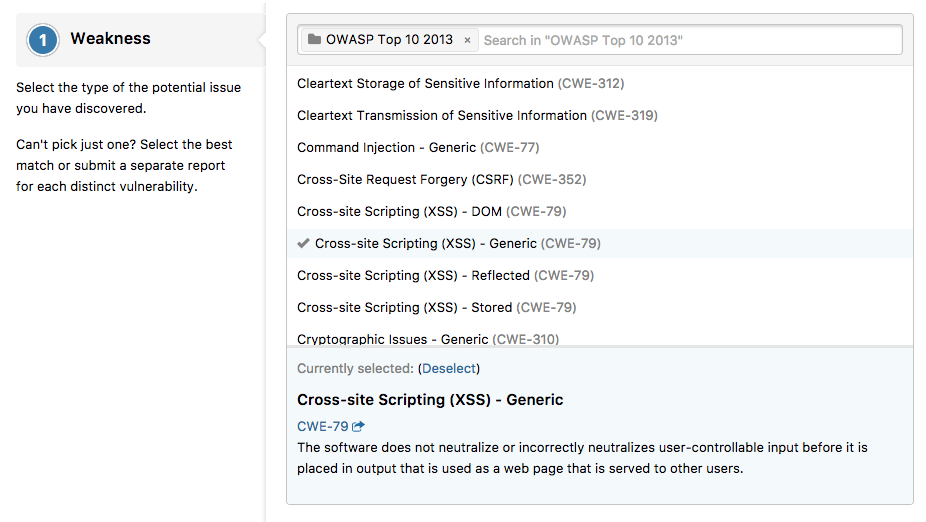 After many iterations, we have released a custom list of weakness types based primarily on CWE that provides comprehensive coverage and flexibility for security teams and hackers.