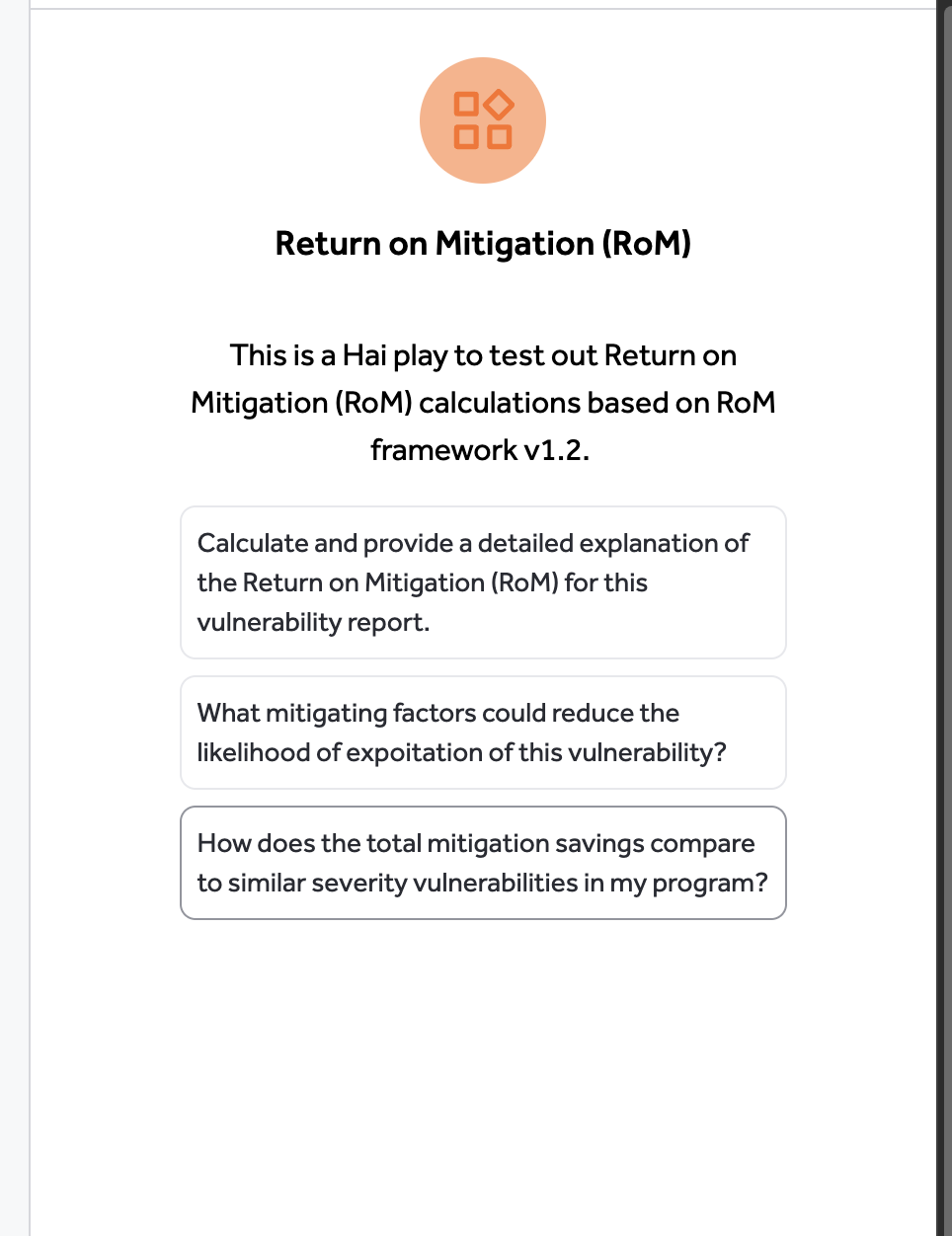 With the HackerOne AI Copilot, Hai, customers can automate RoM calculations on every vulnerability submitted to the HackerOne platform. This means customers can instantly assess the potential financial impact of each vulnerability and prioritize mitigation efforts based on real risk data. By incorporating things like program history, industry benchmarks, and other key factors—such as assigned CVSS, CVE, or EPSS figures—we can bring in various dimensions to our analysis and make these assumptions as realistic, defensible, and actionable as possible, all within the HackerOne platform.